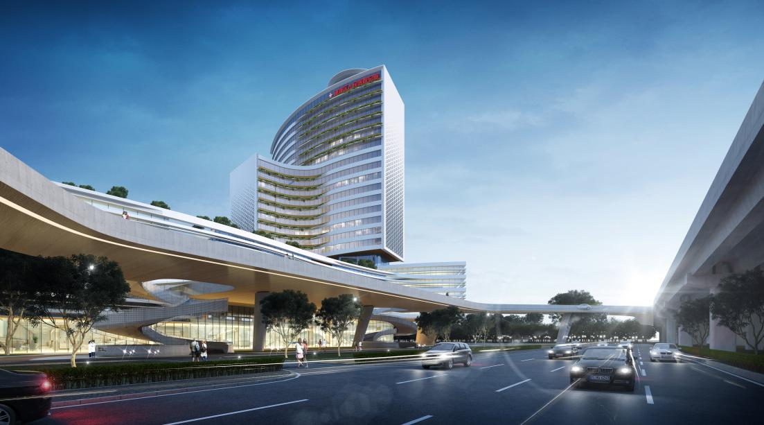 在原有交通体系中,禅西大道高架上的车辆仅能通过辅路、多次掉头到达医院门诊入口,流线繁琐。设计方案在满足原交通基础上,创造性引入”TOD+H“理念,结合医院复杂的功能流线需求,打造高效便捷的就医交通系统:通过从高架桥引出高架辅路,与医院西侧三层平台接驳,形成立体落客区,患者可直接进入医院门诊部三层就诊,方便快捷。同时,在医院内设计立体交通体系,城市车辆可从地面车库入口进入地下一层接驳区,通过车行环线到达医院各个功能区,实现人车分流。