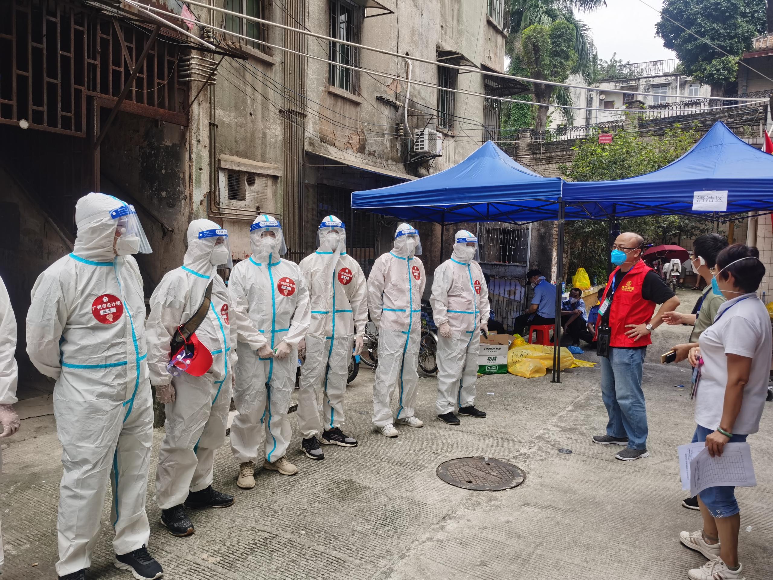 6月5日上午10点多,我院以党团员为主体组建党员突击队,奔赴高风险的荔湾区白鹤洞街鹤建里社区景晖苑开展支援疫情防控志愿服务。在队长梁涛的统一安排下,10位突击队员不惧危险,迅速行动,协助医护人员开展核酸检测、填报社区核酸检测情况明细表、准备样本采样器等工作。越是艰险越向前,在我市疫情防控的关键阶段,院10名突击队员挺身而出、冲锋在前,和当地公安、医护人员组成10支“三人小组”,在这个一出门就大汗淋漓的季节里,尽管身穿密不透风的防护服,但大家始终迈着坚毅豪迈的步伐,用一个下午的时间在全是楼梯房的社区里,走街串巷,爬上爬下,挨家挨户开展核酸检测服务工作,一项接着一项干、一件接着一件办,全程顾不上喝一口水,只顾埋头苦干,整个过程没人有怨言,有的是干劲十足,忘记了劳累和汗水。疫情无情人有情,他们高举“志愿之火”,英勇向前,用实际行动为胸前的党徽、团徽增光,奋力谱写市属国企人的责任担当。